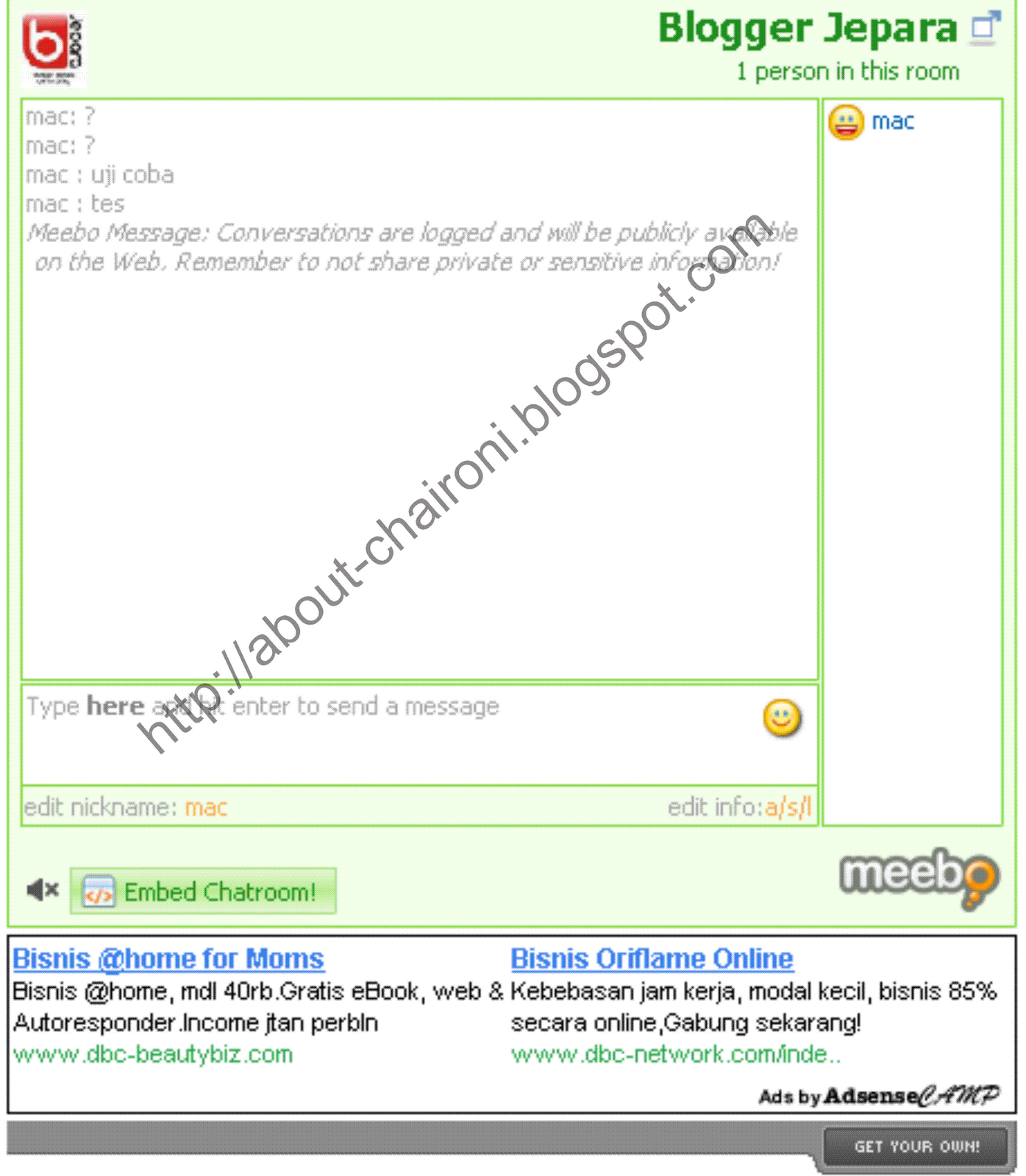 Kabar terbaru untuk para Blogger Jepara. Meebo sekarang sudah mempunyai chatroom Blogger Jepara seperti pada blogku ini, dibawah setelah artikel ini.